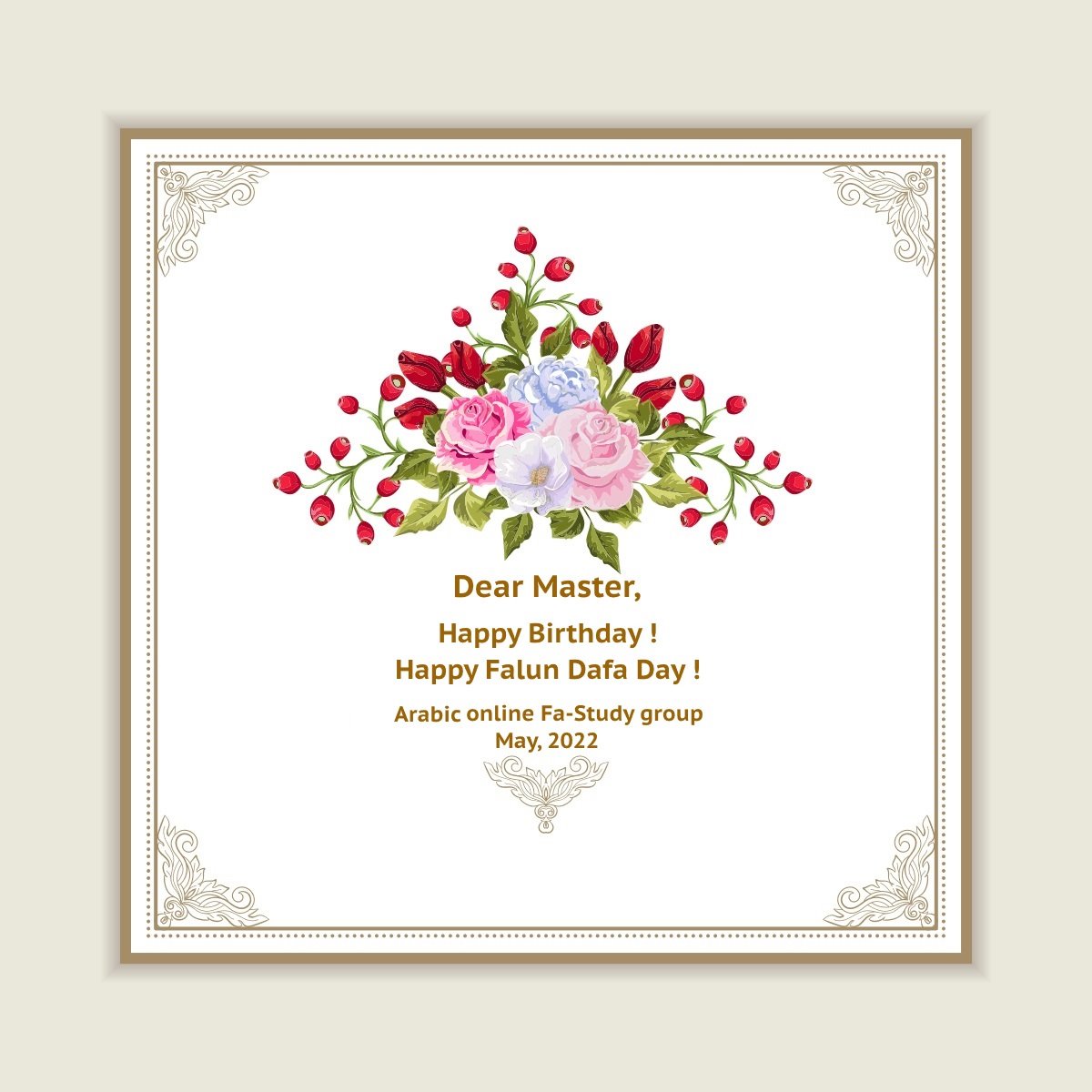 贺卡译文:阿拉伯世界的法轮大法弟子感谢师父并祝愿他在新的一年里吉祥如意!