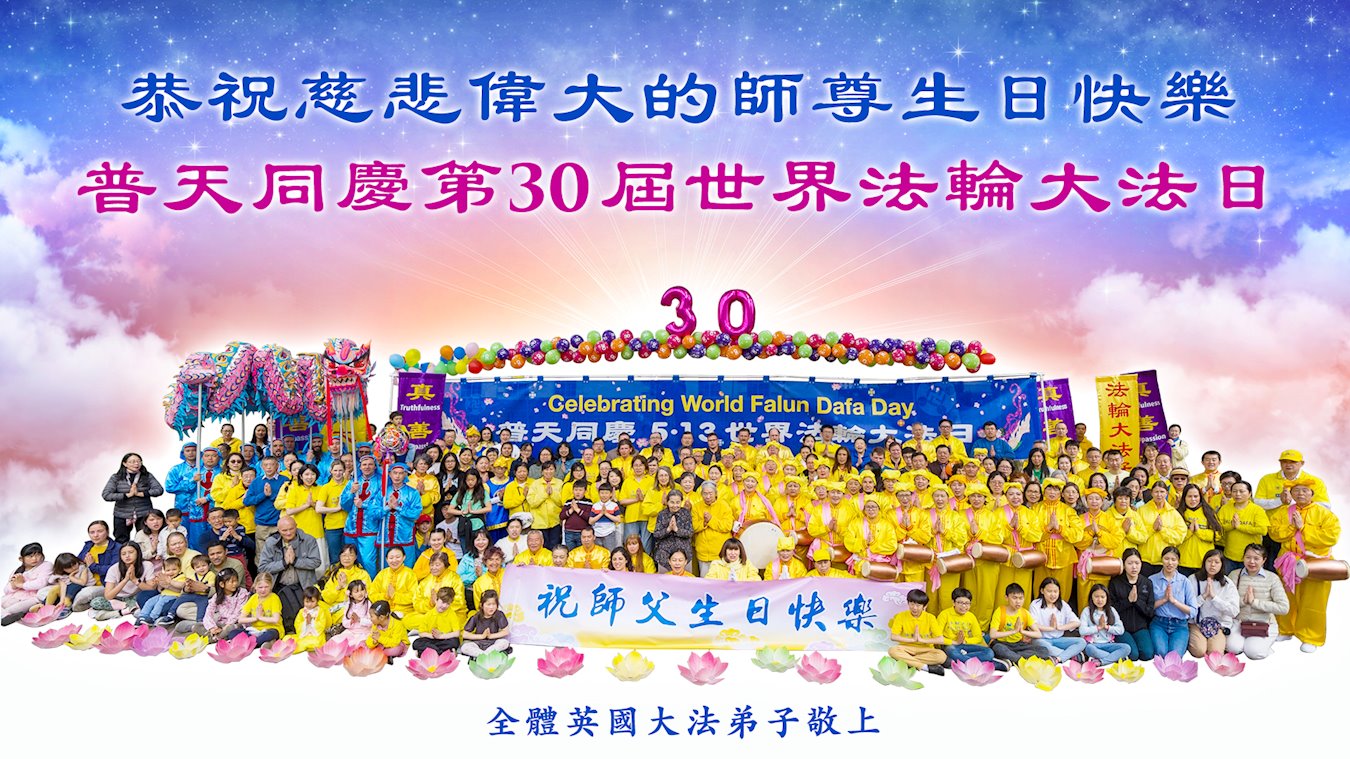 师恩浩荡 年年月月日日时时 护法徒 慈悲无量 章章句句字字遍遍 唤众归 爱尔兰大法弟子叩拜 英国全体大法弟子恭祝慈悲伟大的师尊生日快乐!
