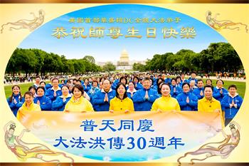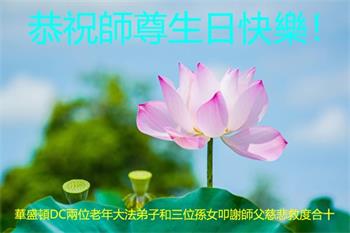 美国首都华盛顿DC大法弟子恭祝师尊生日快乐!普天同庆大法洪传30周年! 华盛顿DC两位老年大法弟子和三位孙女恭祝师尊生日快乐!师父好法轮大法好真善忍好 恭贺世界法轮大法日 大法洪传三十年 真善忍光照世间 谢师恩普天同庆 众生得救上渡船 华盛顿DC两位老年大法弟子和三位孙女叩谢师父慈悲救度 美国纽约大法弟子恭祝慈悲伟大的师尊生日快乐!法轮大法好 真善忍好 弟子要坚持学好法 完成好大法弟子的历史使命 修好自己救度众生。 美国纽约大法弟子感恩师尊洪恩浩荡! 阿拉伯世界的法轮大法弟子感谢师父并祝愿他在新的一年里吉祥如意!