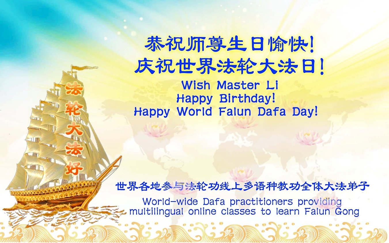 师父,祝您生日快乐! 我们受益于大法的太多,千言万语无以表达对师父和大法的感激之情! 我们代表全校各年级中文班: 祝您生日快乐! 谢谢您! 谢谢法轮大法! 庆祝世界法轮大法日! 意大利卡洛高中全体中文班学生敬上 世界各地参与法轮功线上多种语言教功的全体大法弟子恭贺师尊华诞暨世界法轮大法日!