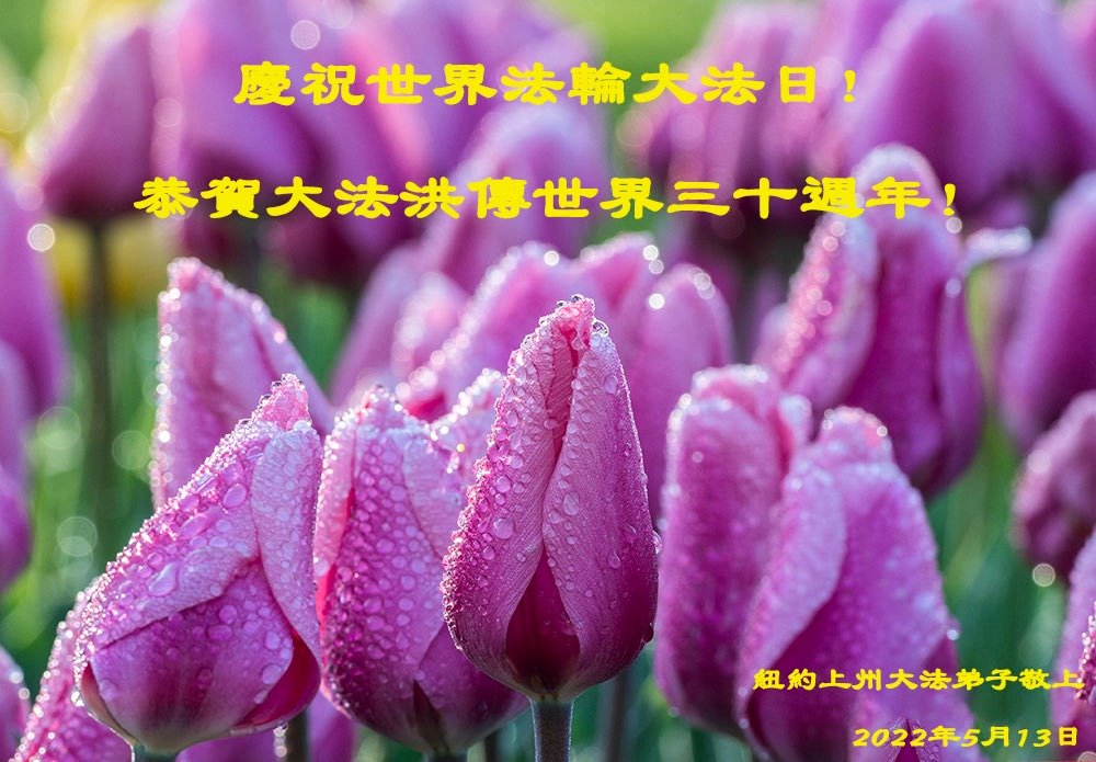 尊敬的师父,您好! 伟大的正法走到今天,迎来了大法洪传三十周年。佛恩浩荡,乾坤再造,穹宇感念!在这伟大的历程中,师尊救度并造就了我们,也救度了无量穹体、无尽众生于坏灭,赐予了我们与众生未来的一切。弟子们与众生对师父、对大法无比感恩之心难以言表。值此二零二二年世界法轮大法圣日来临之际,法国大法弟子向慈悲伟大的师尊表达问候与感恩!恭贺大法洪传三十周年!恭祝师父生日快乐! 三十年颂 普度慈航行四海 寒来暑往三十载 浩荡师恩转法轮 福临万众乾坤泰 法国大法弟子合十敬贺 二零二二年五月 纽约布鲁克林大法弟子恭贺师尊华诞!