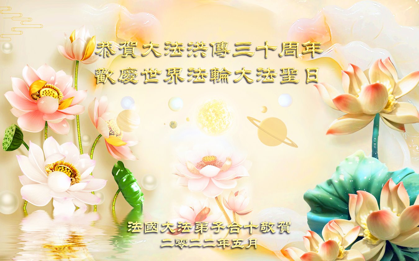 尊敬的师父, 您好! 伟大的正法走到今天,迎来了大法洪传三十周年。佛恩浩荡,乾坤再造,穹宇感念!在这伟大的历程中,师尊救度并造就了我们,也救度了无量穹体、无尽众生于坏灭,赐予了我们与众生未来的一切。弟子们与众生对师父、对大法无比感恩之心难以言表。值此二零二二年世界法轮大法圣日来临之际,法国大法弟子向慈悲伟大的师尊表达问候与感恩!恭贺大法洪传三十周年!恭祝师父生日快乐! 三十年颂 普度慈航行四海 寒来暑往三十载 浩荡师恩转法轮 福临万众乾坤泰 法国大法弟子合十敬贺 二零二二年五月