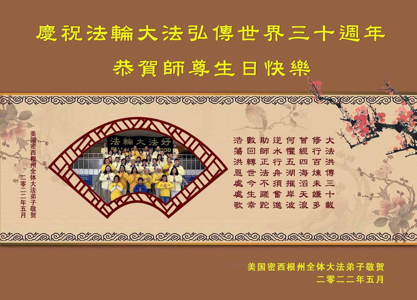 庆祝法轮大法洪传世界三十周年!恭贺师尊生日快乐! —美国密西根全体大法弟子敬贺