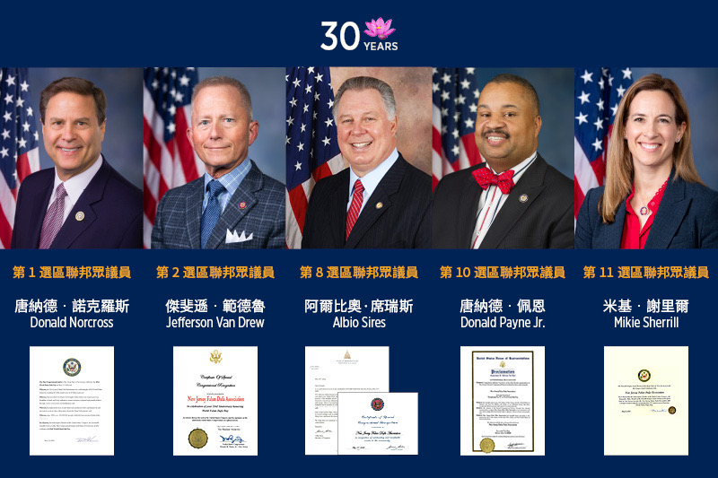 【明慧网二零二二年五月十七日】在庆祝第二十三届“世界法轮大法日”和法轮大法弘传世间三十周年之际,二零二二年五月,美国新泽西州政要纷纷发来褒奖与贺信,赞扬法轮大法的祥和与美好;同时,对中共迫害法轮功修炼者罪行关注和谴责。其中包括,新泽西州第一、第二、第八、第十、和第十一选区的五位联邦众议员。 图1:新泽西州第一、二、八、十、十一选区的五位联邦众议员发来贺信和褒奖,庆祝第二十三届“世界法轮大法日”和法轮大法弘传世间三十周年。 |