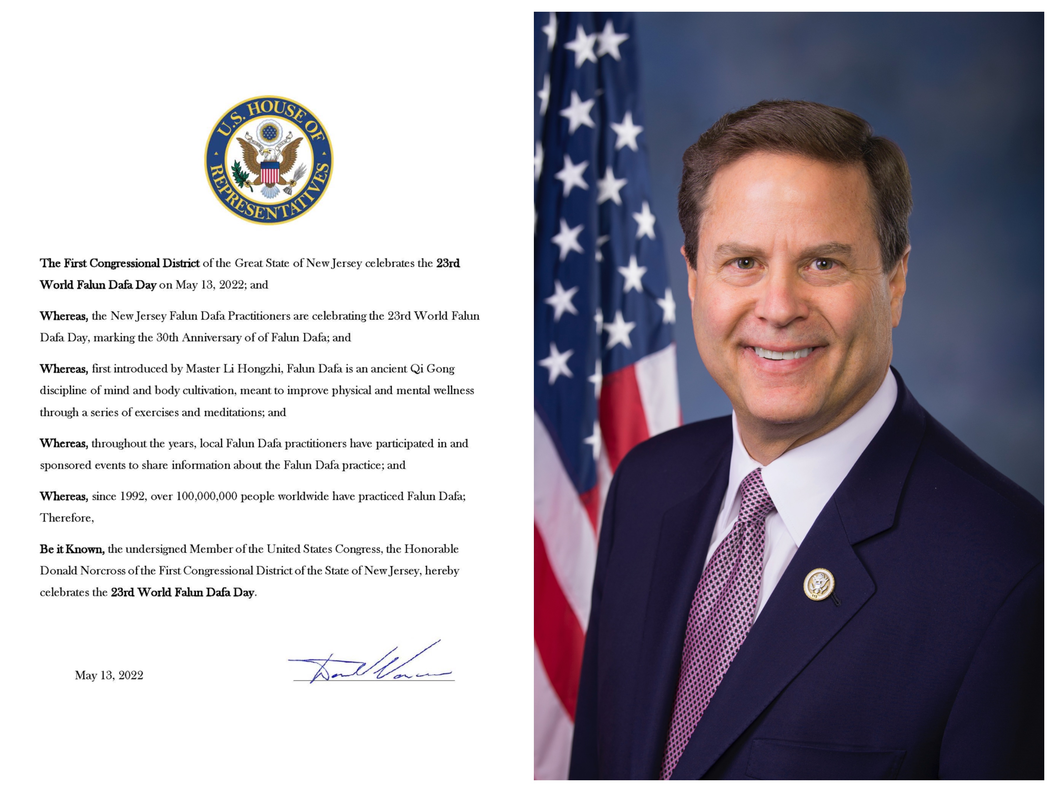 这五位发来褒奖的联邦众议员是:新泽西州第一选区联邦众议员唐纳德·诺克罗斯(Donald Norcross),第二选区联邦众议员杰斐逊·范德鲁(Jefferson Van Drew),新泽西州第八选区联邦众议员阿尔比奥·西雷斯(Albio Sires),第十选区联邦众议员唐纳德·佩恩(Donald Payne Jr.),和第十一选区联邦众议员米基·谢里尔(Mikie Sherrill)。  图2:新泽西州第一选区联邦众议员唐纳德·诺克罗斯(Donald Norcross)在褒奖中赞誉“法轮大法是一门古老的气功,通过打坐修炼而促使身体、思想和精神受益”,“特此庆祝第二十三届世界法轮大法日”。 |