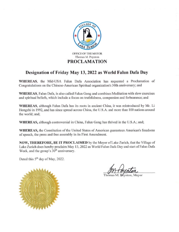 以下为苏黎世湖市褒奖译文: 鉴于,美中法轮大法协会申请褒奖祝贺法轮大法弘传三十周年;以及 鉴于,法轮大法,也被称为法轮功,结合了真、善、忍为核心的精神修炼和柔缓的功法;以及 鉴于,法轮大法根植于中国传统文化,并于一九九二年由李洪志先生公开传出,弘传于中国,美国和世界上一百多个国家; 以及 鉴于, 尽管在中国有争议,法轮大法在美国蓬勃发展;以及 鉴于,《美利坚合众国宪法》在其第一修正案中保障了美国人的言论自由,新闻自由和集会自由。 因此,现在,苏黎世湖市的市长,特此宣布二零二二年五月十三日为“法轮大法日”,以及随后的一周为法轮大法周,并庆祝法轮大法洪传30周年。 托马斯·波因顿 苏黎世湖市 市长
