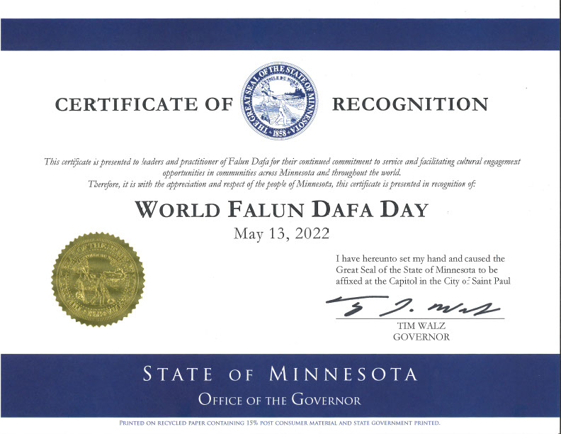 | 【明慧网二零二二年五月三十一日】二零二二年五月,法轮大法弘传世界三十周年之际,美国明尼苏达州州长及多位政界人士发来贺信或邮件,褒奖和庆祝五月十三日世界法轮大法日。 明尼苏达州州长蒂姆·沃尔兹(Tim Walz)颁发证书,表彰法轮大法的创始人及修炼者。明尼苏达州参议员约翰·霍夫曼(John Hoffman)发贺信,表示支持法轮功。明尼苏达州立法助理凯文・帕克(Kevin Parker)发邮件,表示:“我将永远是法轮大法的朋友。”  图1:明尼苏达州州长蒂姆·沃尔兹(Tim Walz)颁发证书,表彰法轮大法的创始人及修炼者。 |