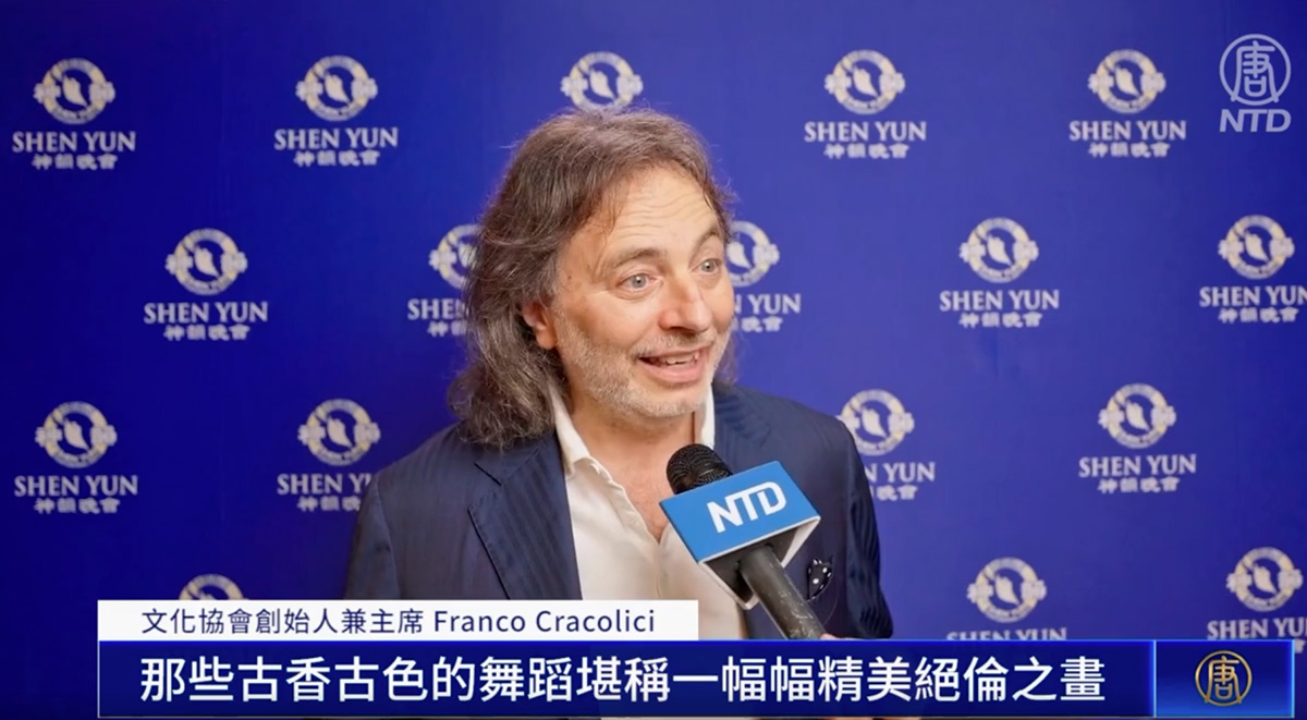 意大利著名文化协会创始人:重现人类辉煌历史  图5:二零二二年五月二十五日,文化协会“La Compagnia del Tao大道组织”的创始人和主席佛朗哥·克拉科利奇(Franco Cracolici)观看了神韵纽约艺术团在意大利佛罗伦萨威尔第剧院(Teatro Verdi)的首场演出。他激动不已。(新!唐!人:电视截图) |
