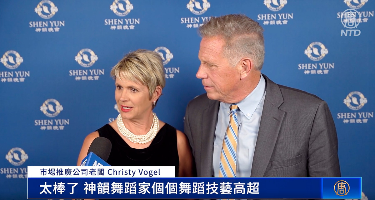 丹妮拉·德蒂诺娃(Daniela Drtinova)是捷克家喻户晓的电视节目主持人,曾在捷克电视台主持过多档非常受欢迎的新闻节目,还获得过捷克新闻大奖。然而,在接受采访时,她说:“我根本就不敢评价(神韵),因为一切都是超凡脱俗的,就像这个名字的含义一样。那是一种你甚至无法评判或者评论的演出,只能怀著敬畏去欣赏。因为你知道这些动作就像是祈祷,或者说是超越这个世界的表达方式,已经是超越我们人类的了。” 她说:“我在那里最强烈感受到的是真相、宽恕以及善良,这与我如此接近,因为我的信仰是基于爱,这些只是同一事物的不同名称。我在刚才看到的演出中感受到的,就是充满真与善。” 她并说:看完神韵走出剧院时,感觉自己“就像是在充满信仰的教堂,用心祈祷后离开时的感觉一样。” 公司老板:曾经的中国充满关爱  图7:二零二二年五月二十七日晚,市场推广公司老板克里斯蒂·沃格尔(Christy Vogel,左)和丈夫比尔·沃格尔(Bill Vogel)观看了神韵北美艺术团,在圣彼得堡杜克能源表演艺术中心-马哈菲剧院的第三场演出。(新!唐!人:电视台) |