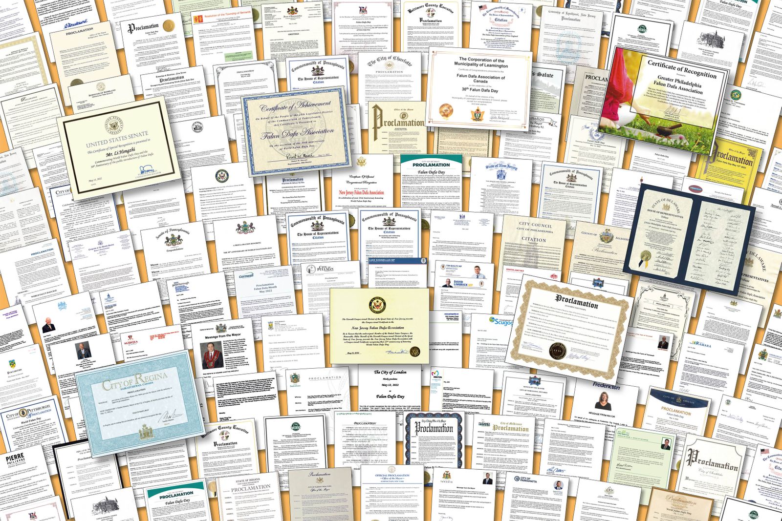 【明慧网二零二二年六月十一日】(明慧记者雪莉、高思羽综合报道)今年的“五·一三”是法轮大法洪传三十周年,亦是第二十三届世界法轮大法日,美国、加拿大、欧洲、澳洲和台湾,有上千位政要对法轮大法及其创始人李洪志先生颁发褒奖贺信。他们在褒奖和贺信中高度赞扬法轮功修炼对个人道德素养的提高、对社区整体的积极影响,包括法轮功学员在疫情期间为所在社区民众健康所作的努力。 图1:上千位政要在法轮大法洪传三十年之际,对法轮大法及其创始人李洪志先生颁发褒奖贺信表示赞扬和感谢,其中包括美国、加拿大、英国、德国、瑞典、瑞士、爱尔兰、澳洲、日本和台湾的各级政府官员。图为部分褒奖。(大.纪.元;) |