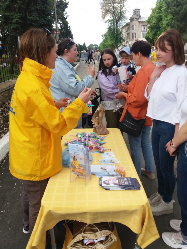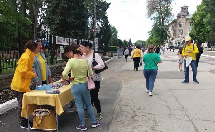 图7~9:二零二二年五月十五日,来自基希讷乌和罗马尼亚的法轮功学员在摩尔多瓦人口第二大城市巴尔蒂举办弘法活动。不少路人驻足了解。 |