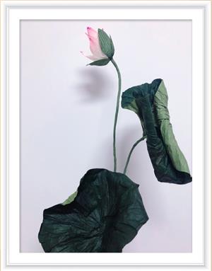 作品材料:皱纹纸、纸藤、浮染纸、花艺铁丝等作品规格:纸花组合约38cm×50cm作品说明: