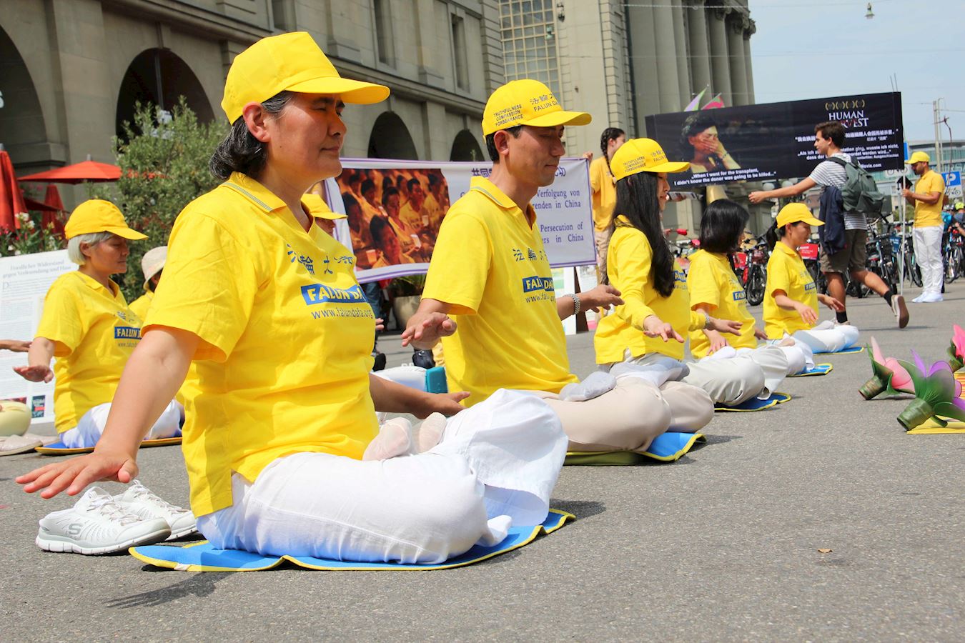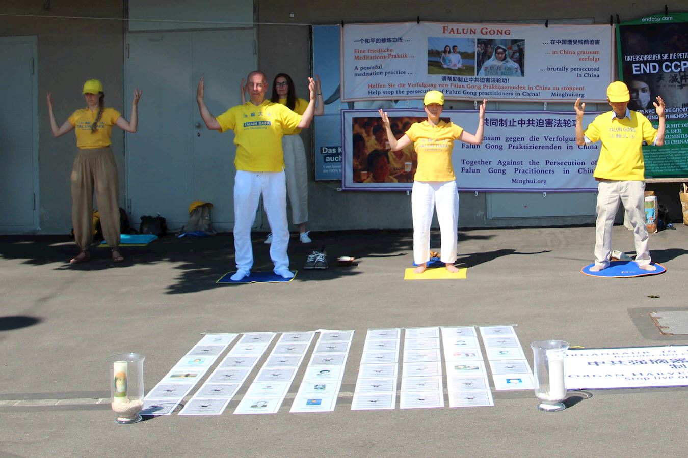| 【明慧网二零二二年七月二十九日】(明慧记者高思羽瑞士采访报道)“(中共迫害法轮功)如此严重,这是一场灾难,让人感到非常伤心。这迫害如此邪恶,早就该结束,不能再继续下去了。我希望能让尽可能多的人知道这件事,一起出力,共同制止这邪恶的迫害!”伊莎贝尔(Isabell)在苏黎世为制止迫害法轮功签名后谈到。 二零二二年七月二十二日及二十三日,瑞士法轮功学员在最大城市苏黎世及首都伯尔尼举办集会,向民众展示功法,并通过演讲向路人介绍法轮功给人带来的身心受益,揭露中共迫害法轮功的罪行并说明中共迫害的原因。瑞士政要发来支持信,路人也纷纷签名支持法轮功学员,并感谢学员的付出。 七月二十二日,法轮功学员在苏黎世中领馆附近主干道边炼功,征签,并在市中心阅兵广场(Paradeplatz)举办集会。  图1:七月二十二日,法轮功学员在苏黎世中领馆附近炼功 |