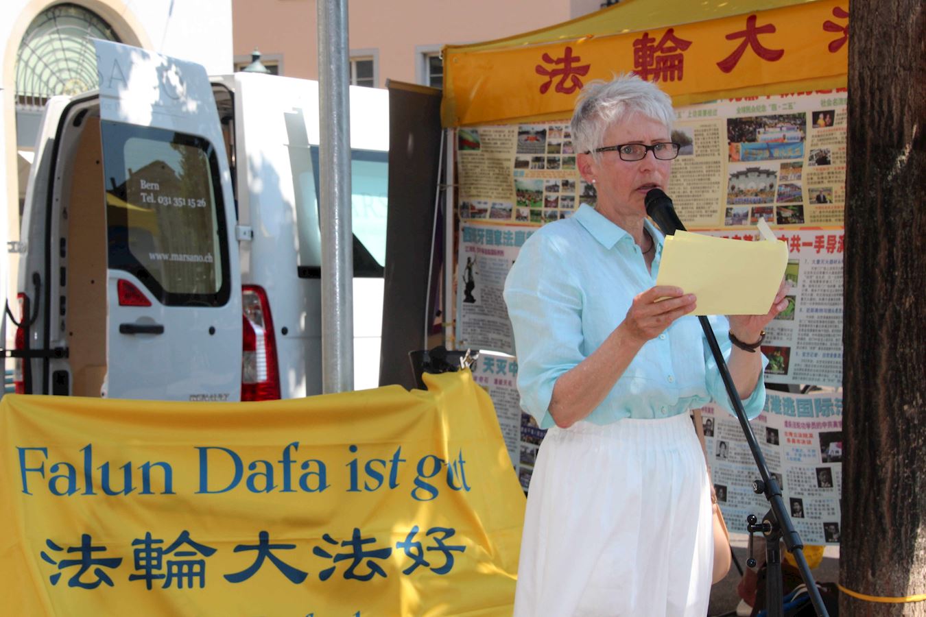 圣加伦州议员伯恩哈德·豪瑟(Dr. Bernhard Hauser)博士谈到,中共统治下的中国属于世界上践踏人权最严重的国家之一,他认为:“需要采取明确的更广泛的抵抗中共政权的行动,因为(中共)对新疆人、法轮功学员系统性的迫害及当下的对台湾的威胁是不能容忍的。” 他还感谢:“所有为(支持)法轮功也即在世界各地为言论自由而努力的人们。”  图12:前圣加伦州议员伊娃·凯勒(Eva Keller) |