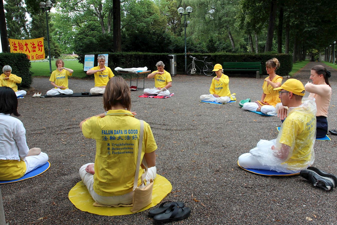 图5:七月二十三日上午,部份法轮功学员在伯尔尼景点玫瑰园集体炼功 |