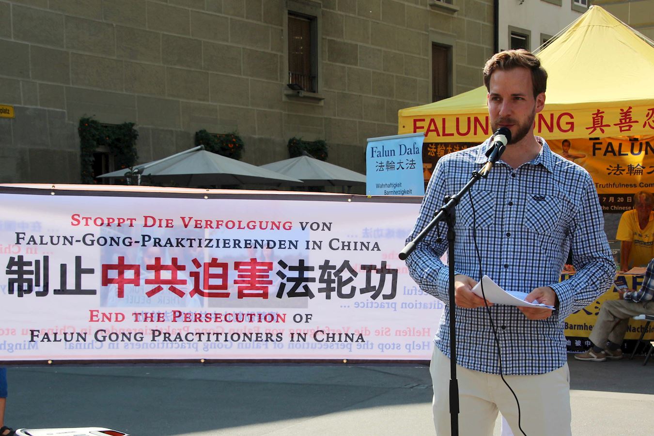 第二天,在首都伯尔尼市中心控豪斯(Kornhaus)广场举办了类似的集会。部份学员在集会前前往中共驻瑞士使馆,宣读了公开信,希望使馆工作人员能明辨是非,做出正确的选择。  图3:法轮功学员在苏黎世市中心演讲,介绍法轮功的美好并揭露中共迫害法轮功的罪行 |