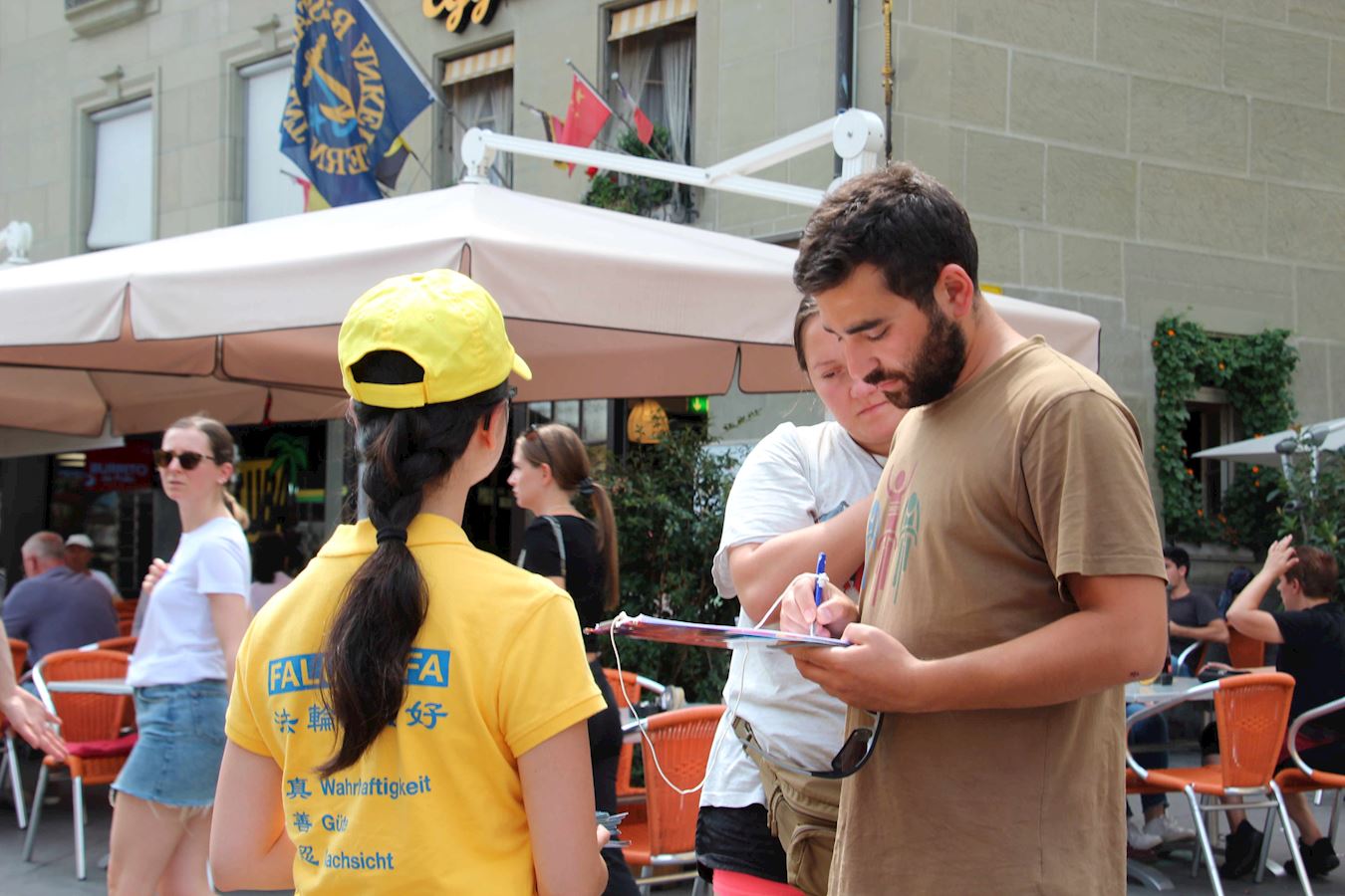 前瑞士国民院议员奥斯卡·弗莱辛格(Oskar Freysinger)在信中写道:“今天你们聚集在一起,反抗中共的野蛮行径,证明同情心,慈善及人的尊严对你们而言是不可侵犯的。我对此非常感谢并赞叹。你们的行为展现了你们的勇气,证明你们不会向独裁者屈服。” 退休教师:“绝对应该制止迫害” 罗曼·格拉泽尔(Roman Glaser)是一位退休老师,在苏黎世第一次听说法轮功。谈及中共23年来的迫害,他认为:“这是一场灾难,无法想象,不可理喻,如此血腥,毫无人性。当然,毫无疑问,绝对应该制止迫害。” 他认为中共妄图在世界各地扩大影响,因此希望通过自己的签名:“能有更多的签名,让更多人能够得到更多的讯息。也让那些不假思索和中共做生意的人们有所考虑,其后果是什么。” 古巴翻译:“我们全力反对迫害” 玛丽贝尔·加西亚·冈萨勒(Maribel Garcia Gunzaler)来自古巴,现居住在瑞士,从事翻译顾问的工作。当她和当记者的朋友在苏黎世看到法轮功时,她非常高兴地介绍朋友采访学员,并帮忙翻译。 她谈到自己之前也学炼过法轮功,感觉非常好:“炼功给我带来平静,从一开始就感到很大的能量。”当时因为时间有限,没有继续下去,现她正考虑重新开始修炼。 在签名支持法轮功学员后,她谈到:“我当然全力反对迫害,我们古巴人也深受迫害之苦。我们非常遗憾有(迫害)这样的事情发生,中共政权的所为真是太血腥了。”她也感佩法轮功学员23年来坚持反迫害:“需要有人一直坚持下去,直到迫害结束。” “让更多人了解发生的这一切(迫害)” 在销售业工作的加布里埃拉·艾力克(Gabriela Alic)在伯尔尼的集会上得到了一份真相资料,她静静地读着,并不住地摇头,随后又认真地聆听学员演讲的内容。  图14:加布里埃拉·艾力克(Gabriela Alic)签名支持法轮功学员,并希望能有更多人来关注法轮功学员所遭到的迫害 |