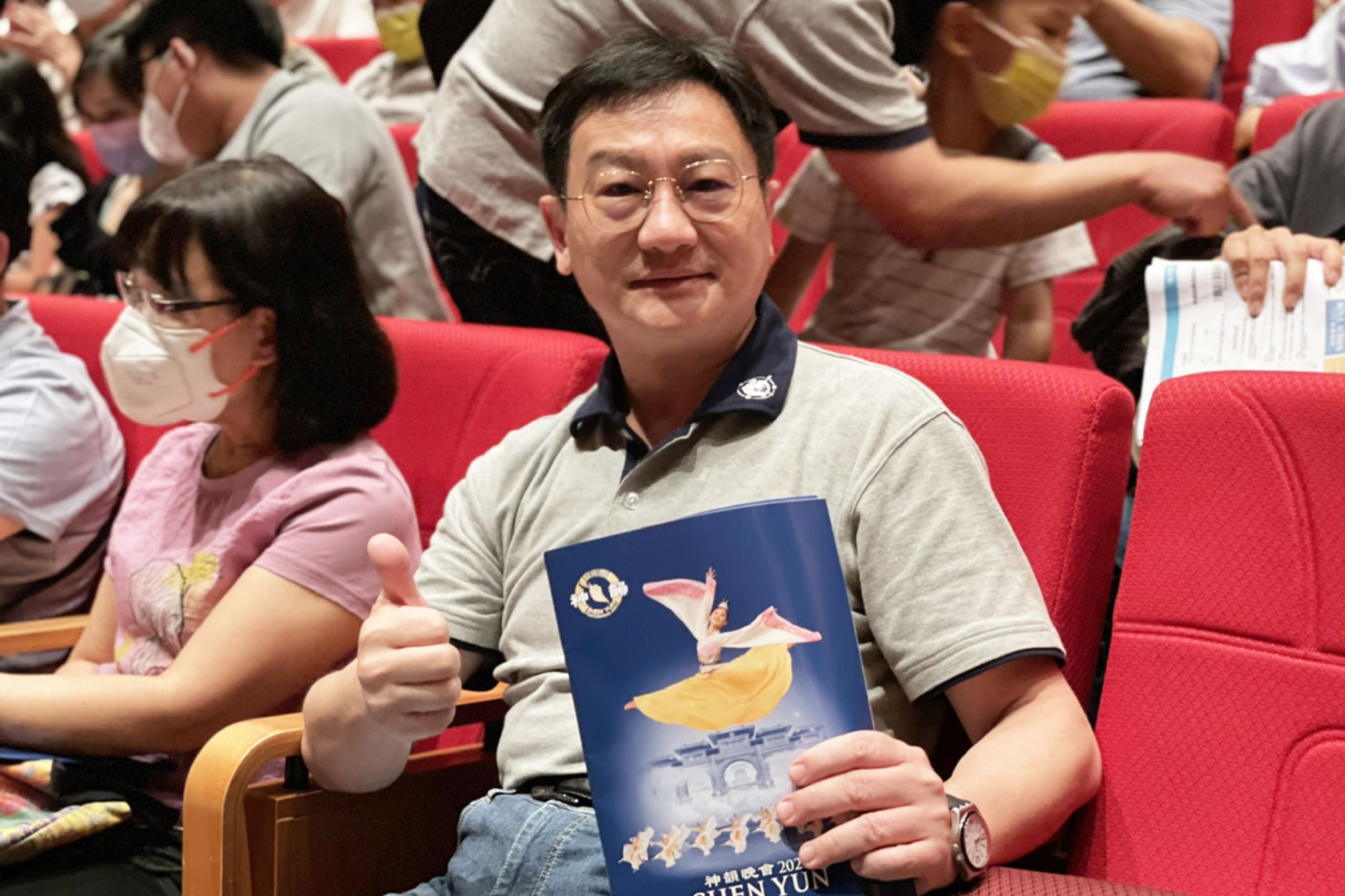 台中市商业会一行六十余人,七月一日晚间来欣赏演出。大幕一拉开,台中市商业会常务理事颜嘉益就为画面的气势与用心所感动。 “每一幕我都很用心地在看,后来我看到了‘真、善、忍’三个字,原来这个艺术演出表现的真的是真、善、忍”。 神韵的节目从远古跨越到现代,颜嘉益觉得演出“把生活的那一面,把人性的那一面,表现的非常真实”。 “神韵就好像神给我一种力量,用柔和的方式带给我刚强的力量。”颜嘉益说:“演员的肢体动作看起来很美,他们一定用了很多的时间、精神,还有忍耐(来练习),让观众用非常舒缓的心情去体会到人生,这不是一般的艺术团体可以表现出来的。” 获奖庄园董事长:顶尖的世界水准  图9:二零二二年七月三日晚间,公司董事长陈盈豪观赏神韵国际艺术团在彰化县员林演艺厅的第二场演出。 |