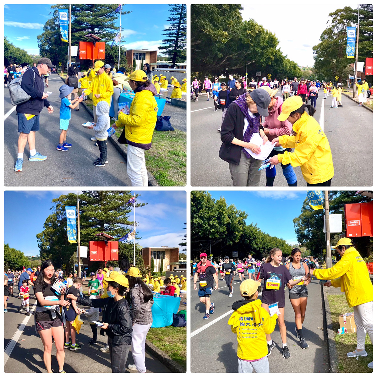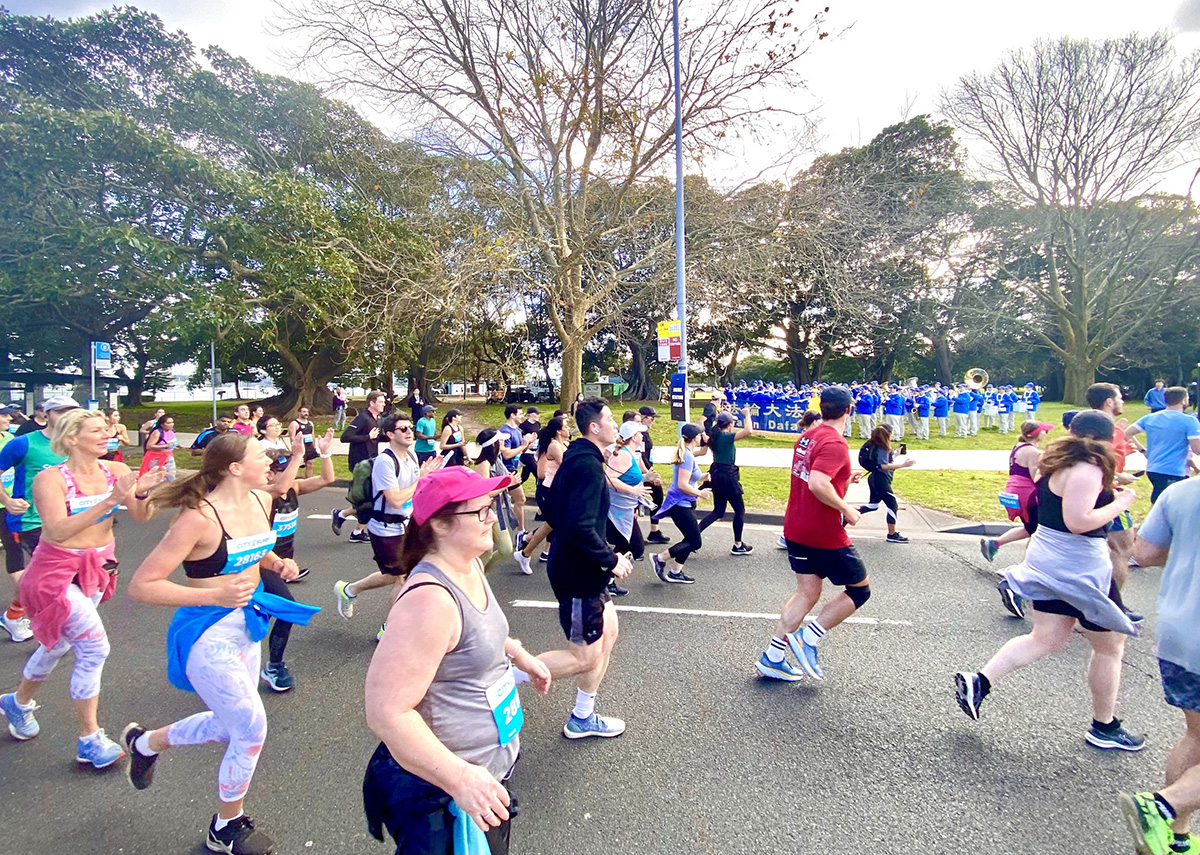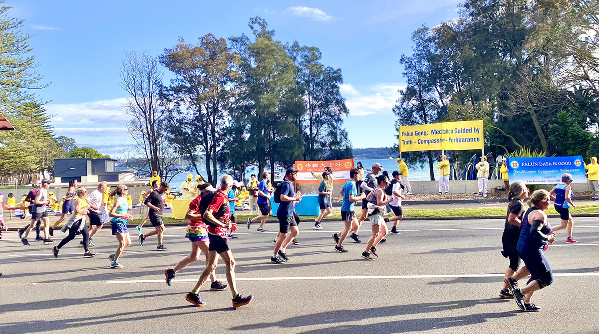 【明慧网二零二二年八月二十日】(明慧悉尼记者站采访报道)二零二二年八月十四日,“法轮大法好”和“法轮功遵照真善忍修炼”等横幅,与正在演示法轮功五套功法、身着亮丽黄色炼功服的学员们,在悉尼玫瑰湾(Rose Bay)海滩的晨曦下显得格外耀眼夺目,构成了一道天然美丽的风景线!当潮水般的“从城市到海滩”(City to Surf)赛跑者汹涌而至时,不由得被法轮功的纯正祥和能量吸引。 图1~3:“从城市到海滩”(City to Surf)慈善马拉松长跑途中,如潮水般的赛跑者汹涌而至与祥和的法轮功学员的晨炼在动静中相映成辉 |