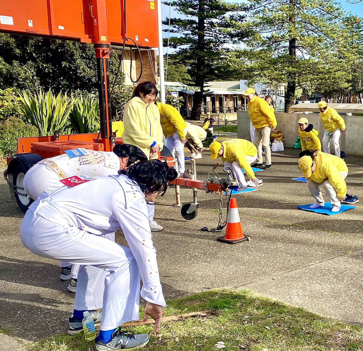 一年一度的世界上最大规模“从城市到海滩”澳洲慈善马拉松兴趣赛跑活动已拥有五十年悠久并富有启发性的历史。由于中共病毒大流行而中断了两年后,赛跑者在南半球冬天的晨曦中再次相聚,本次活动也承负着今年为超过三百家慈善机构募捐而参赛,这使整个活动焕发着美好与积极向上的能量场。  图4~5:人们纷纷加入法轮功学员的集体炼功 |