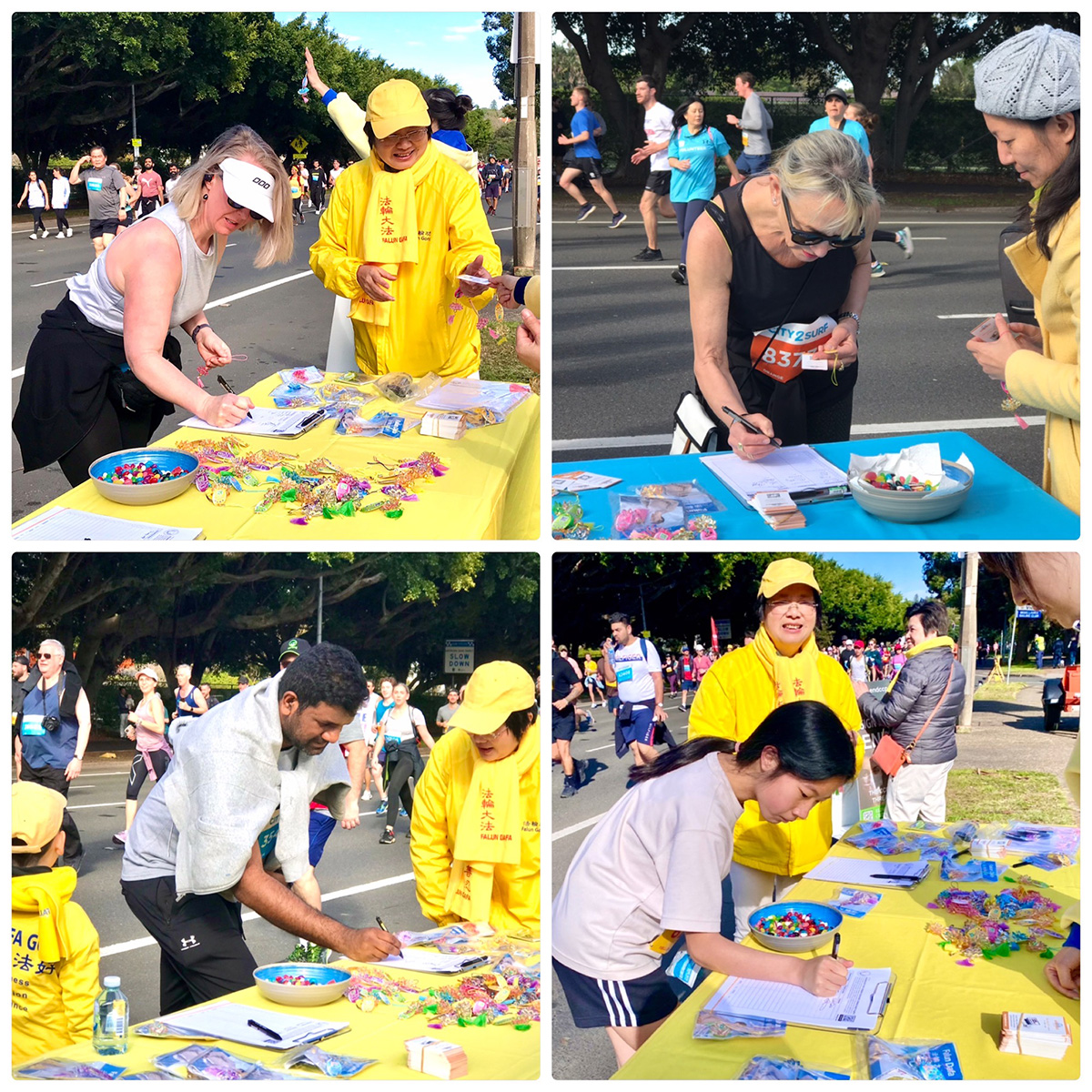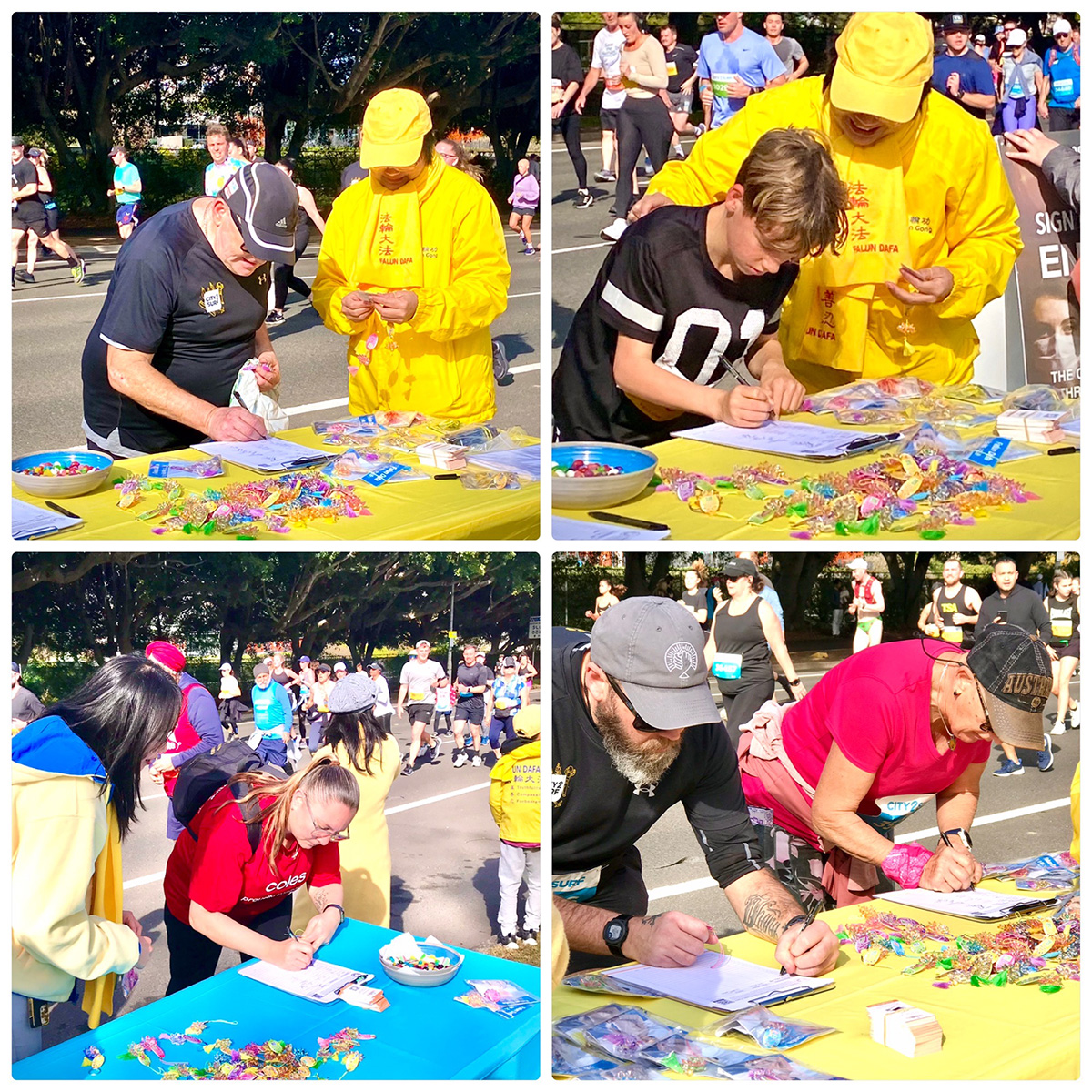 当这些赛跑者经过法轮功真相展位时,很多人前来感谢法轮功学员的到来,有的径直拿起笔签名支持法轮功反迫害;有的被法轮功强大的正能量吸引着,径直走入法轮功团体中学起炼功动作;还有的人问询平时在哪里可以学炼法轮功,他们表示还想回去继续了解更多法轮功真相。  图6~11:许多赛跑者经过法轮功学员的活动场地,纷纷前来签名支持法轮功反迫害。 |