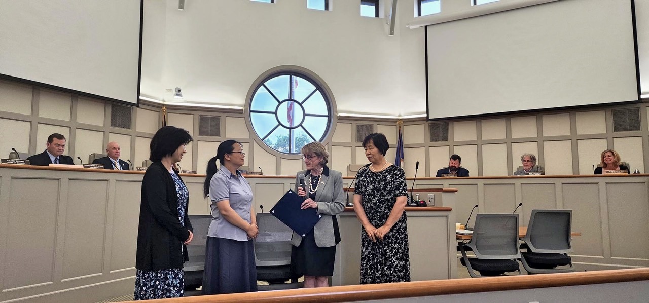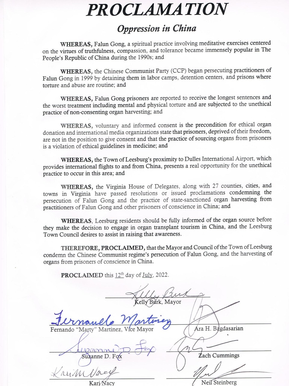 【明慧网二零二二年八月六日】二零二二年七月十二日美国弗吉尼亚州最大镇利斯堡镇(Leesburg Town)议会全票通过一项公告(Proclamation),谴责中共对法轮功学员的迫害,特别是活摘良心犯器官的罪行。 图1:市长凯丽·伯克(Kelly Burk)给当地法轮功学员颁发公告令。 |