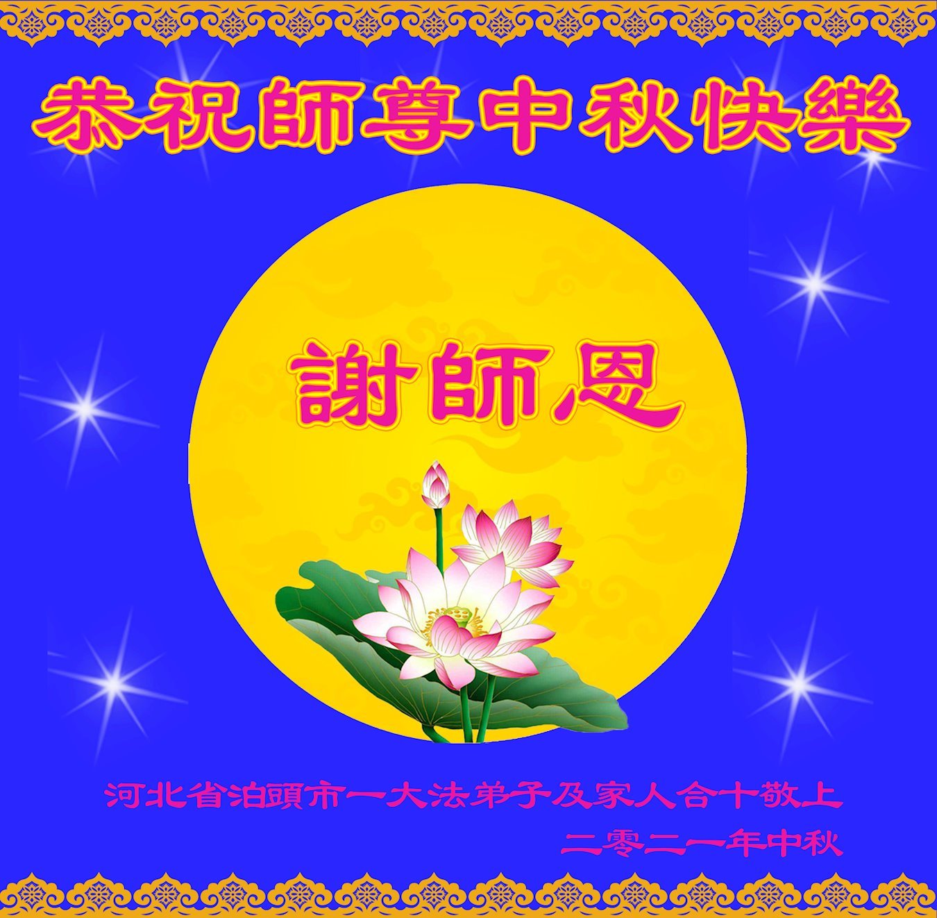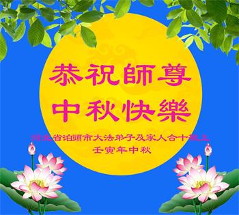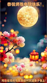 一年一度的中秋来临之际,曲周城北大法弟子恭祝师尊中秋快乐! 感恩师尊慈悲苦度! 河北省沧州市泊头市大法弟子及家人恭祝师尊中秋节快乐!