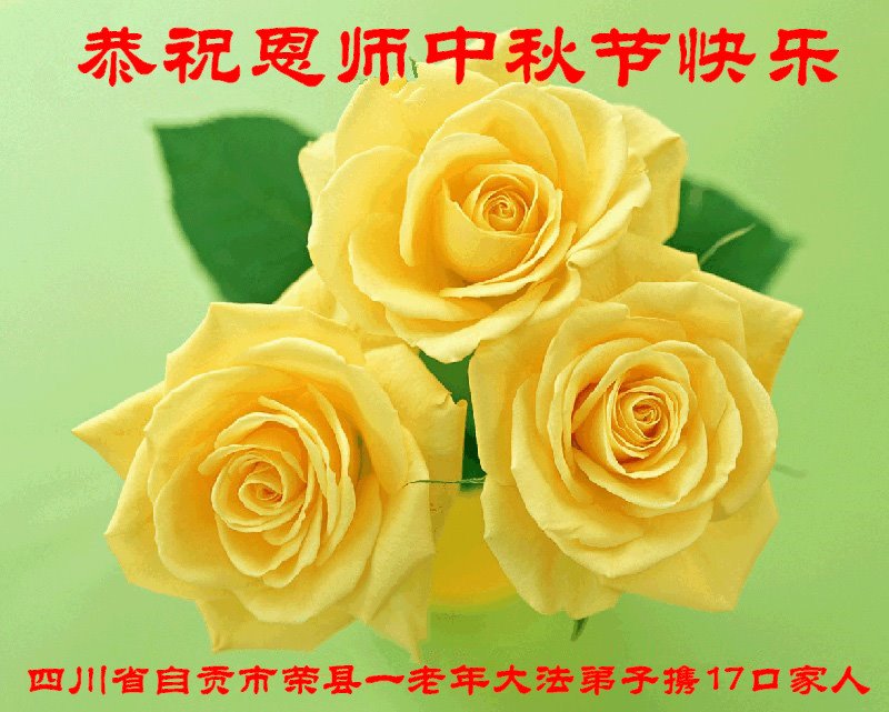 四川省自贡市荣县一老年大法弟子携17口家人恭祝恩师中秋节快乐!