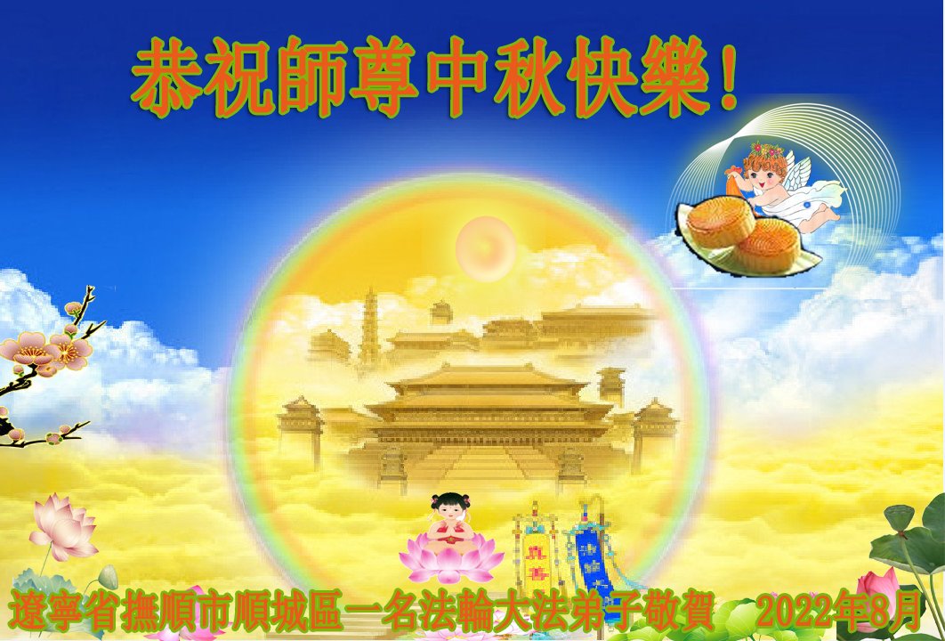 师父您好! 弟子谨记师尊的话,修好自己,每天做好三件事,盼望与师父团圆的那一天。请师尊放心。 抚顺市顺城区一名法轮大法弟子叩拜 2022年8月29日 辽宁省抚顺市全体大法弟子恭祝师尊中秋节快乐!