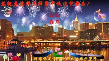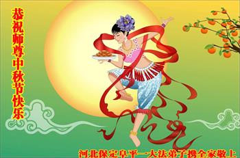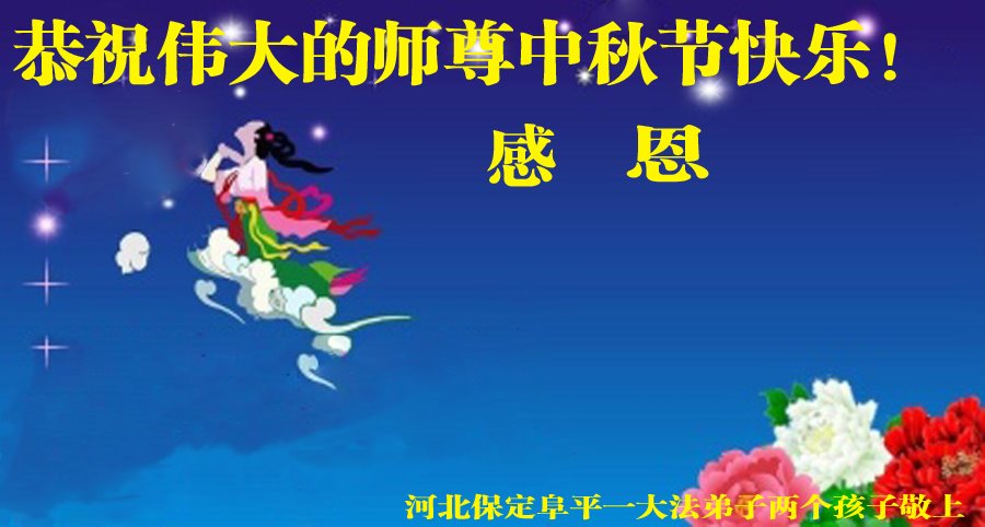 师尊您好!师尊您辛苦了!在中秋节到来之前,给师尊写几句肺腑之言:在这一年里,在师尊的保护和点悟中得到了升华,提高了层次,感恩师尊! 叩拜师尊!祝师尊中秋节快乐! 河北保定博县城内全体大法弟子恭祝慈悲伟大师尊中秋佳节快乐!