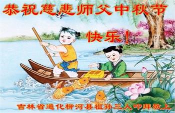 弟子怀着无比感恩的心向慈悲伟大的师尊问好!叩拜师尊,请师尊放心我们会更好的听师尊的话,修好自己,更加努力的做好三件事,多救人,决不辜负师尊对我们的期望。兑现誓约!跟师父回家!合十 吉林省通化柳河县大法弟子祖孙三人恭祝慈悲伟大的师尊中秋节快乐!