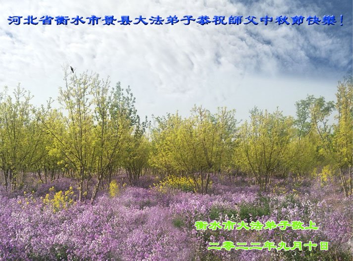 中秋佳节临 明月天边升 家家团圆日 法徒想师尊 正法洪势近 人间传喜讯 黄花遍地开 普天颂师恩 祝愿师尊中秋佳节快乐! 跪拜师尊!跪拜师尊! 河北衡水市一大法弟子恭祝师尊中秋节快乐!