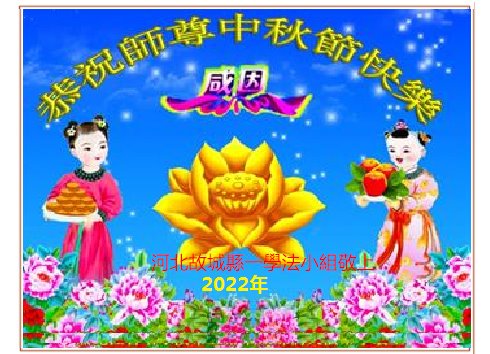 【明慧网二零二二年九月八日】 河北省衡水市阜城县全体大法弟子恭祝慈悲伟大的师尊中秋快乐!