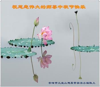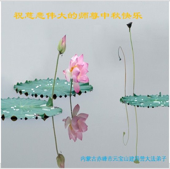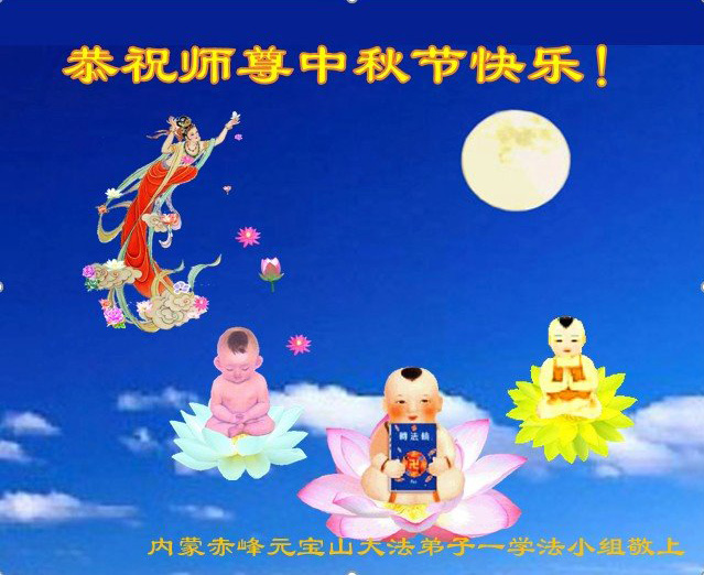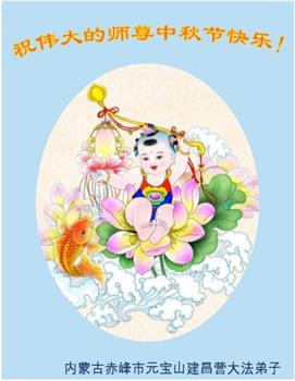 恭祝慈悲伟大的师尊中秋快乐! 慈悲伟大的师尊把我们从地狱中捞起洗净又传给我们宇宙根本大法,弟子们无法用语言感恩慈悲伟大的师尊,弟子们唯有对大法的心坚如磐石亘古不变。内蒙古赤峰市元宝山建昌营所有大法弟子唯有多学法修好自己,做好三件事,圆满随师还,惟愿师尊笑。 内蒙古赤峰市元宝山建昌营大法弟子恭祝慈悲伟大的师尊中秋节快乐!