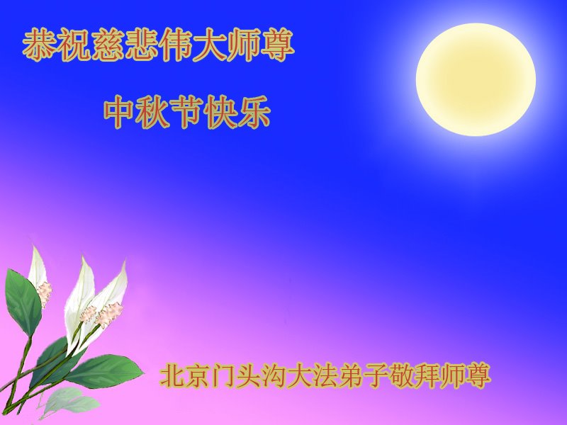 师尊好:门头沟大法弟子想念您!我们要努力做好,不辜负师尊对我们的期盼。 谢谢师尊! 北京市门头沟区大法弟子恭祝师尊中秋佳节快乐!