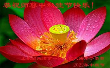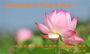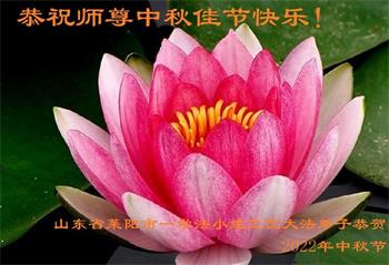 在这大法進程快速推進,师尊传法30周年,反迫害23年,大法弟子快速救人的金秋之季,又迎来了一年一度的中华传统的中秋佳节。此时更加思念时刻在我们身边看护着我们,为我们修炼走好每一步操尽了心的恩师。 在此弟子衷心恭祝恩师中秋节快乐!惟愿师尊笑! 弟子只有精進,再精進!多救人,走好最后的路! 叩拜师尊!合十 山东日照大法弟子敬上 2022年9月1日 山东省泰安市新泰市大法弟子恭祝师父中秋快乐!