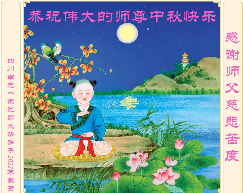 慈悲伟大的师父好! 又是一年中秋团圆日,弟子想念师父,弟子盼望早日见到师父!我一定会按照师父的要求做好三件事,救度更多众生。一年一年数年轮,岁岁年年意不改。 法徒历经九九难,理智清醒志更坚。 夏炼三伏冬数九,金刚之躯永不坏。 徒儿望眼向西方,盼望师尊临回还。 一年一年师保护,路上飞奔比箭快。 真诚恳切为救人,化解恩怨不遗憾。 讥言恶语难动我,慈眉善目心如海。 思念师父泪如雨,勇猛精進不徘徊。 绵阳一大法弟子恭贺 2022年9月3日 四川省绵阳市全体大法弟子恭祝慈悲伟大的师父中秋节快乐!
