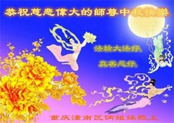 感谢慈悲的师父把弟子从污浊中捞起洗净,使我有幸成为一名正法时期大法弟子,在师父的慈悲保护下助师正法,救度众生,随师把家还。 重庆潼南区姐妹大法弟子恭祝慈悲伟大的师尊中秋快乐!