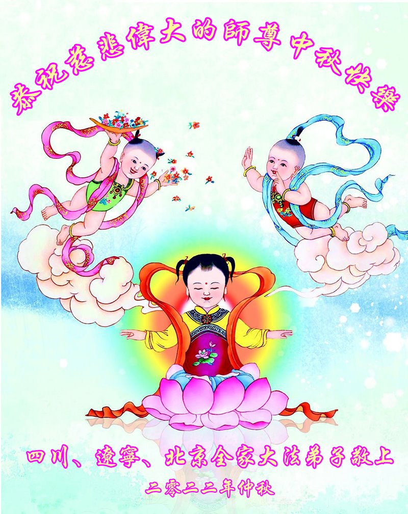 恭祝慈悲伟大的师尊中秋佳节快乐!每逢佳节倍思亲,师父,弟子们想念您,希望早日见到您。我们会学好法,实修自己,做好三件事,兑现誓约。 北京市全体大法弟子跪叩敬上 四川、辽宁、北京等地的全家大法弟子恭祝师尊中秋快乐!