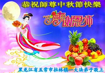 黑龙江省哈尔滨市五常市拉林镇一大法弟子恭祝师尊中秋节快乐!