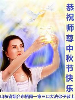 感谢师尊慈悲救度,帮我找回真我,弟子无法用语言来表达对师尊的感恩之情,唯有精進更精進,同化大法,救度众生,让师尊欣慰! 山东省烟台市栖霞一家三口大法弟子恭祝师尊中秋节快乐!