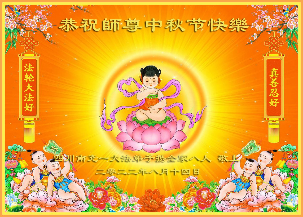 【明慧网二零二二年九月八日】 四川省南充市一大法弟子携全家八人恭祝师尊中秋节快乐!