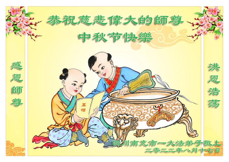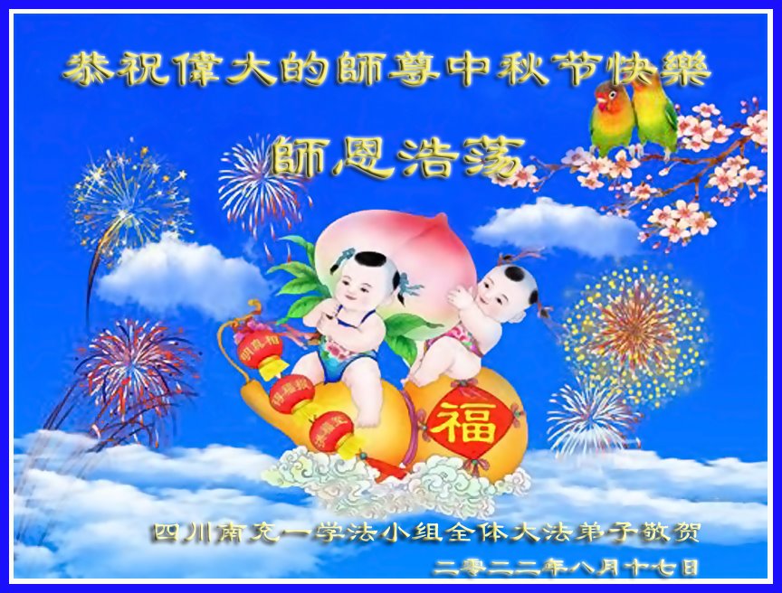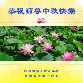 恭祝慈悲伟大的师尊中秋节快乐! 师尊好,您辛苦了!弟子更加努力修正自己,继续做好三件事。以报师恩! 多谢师尊慈悲救度! 四川省自贡市一学法小组大法弟子敬上 四川省广元市苍溪县全体大法弟子恭祝慈悲伟大的师尊中秋节快乐!