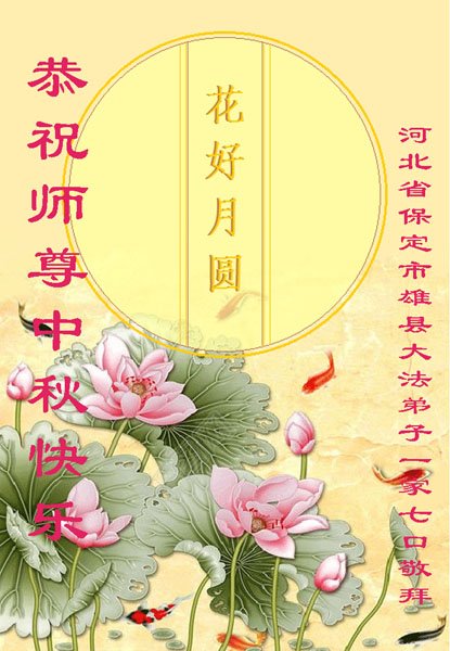 慈悲伟大的师尊: 弟子恭祝慈悲伟大的师尊中秋节快乐! 河北省涿州市一个大法弟子 2022年8月29日 河北省保定地区大法弟子一家三人恭祝慈悲伟大的师尊中秋快乐!