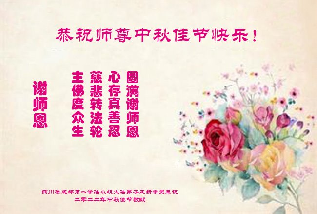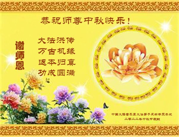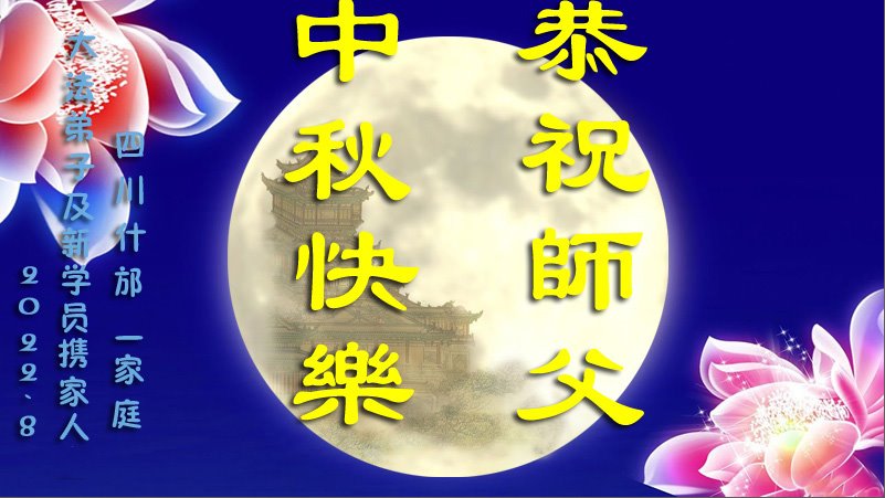 | 【明慧网二零二二年九月九日】(明慧网记者综合报道)法轮大法洪传于世三十载,遭受中共迫害二十三年。在谎言加迫害的血雨腥风中,不断有新人慧眼识正邪,入道得法。千百年来,人们在迷茫中等待,有善根的人内心深处相信有神,末劫之时神会来;今天,终于得到了这万古不遇的真法!在这中秋月圆之时,新学员叩拜慈悲伟大的师尊,恭祝师尊中秋节快乐! 安徽阜阳新学员写道:妻子炼功后,身体上的各种顽疾不药而愈,每天总是乐呵呵的。我也下决心修炼法轮大法了。就这坚定的一念发出不久,体检时发现曾患有的肺间质炎不翼而飞。我要把大法的神奇告诉世人,让全宇宙都知道:法轮大法是天法! 河北保定一名退伍军人说:我曾患胰腺癌且已到晚期。谢谢师父千辛万苦把真、善、忍大法传给您的弟子,感谢您让您的弟子把真相告诉了我们这些未修炼的人,我才如梦初醒!学炼了法轮大法后,末期胰腺癌奇迹般消失,现在无病一身轻! 成都一家大法弟子写道:回首修炼路,大法的法理如此的深刻而令人震撼!一次又一次,我们得到深深的启迪。我们以虔诚的心敬祝师父中秋节快乐! 重庆市荣昌区两位大法新学员恭祝师尊中秋节快乐!