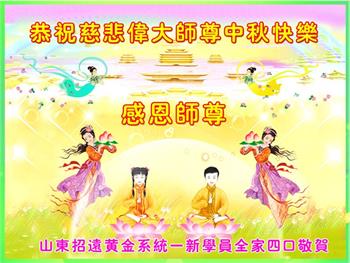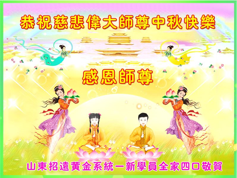 感谢师尊慈悲救度!弟子一定好好修炼,让师尊放心! 山东招远黄金系统一青年新学员全家四口恭祝慈悲的师尊中秋节快乐!