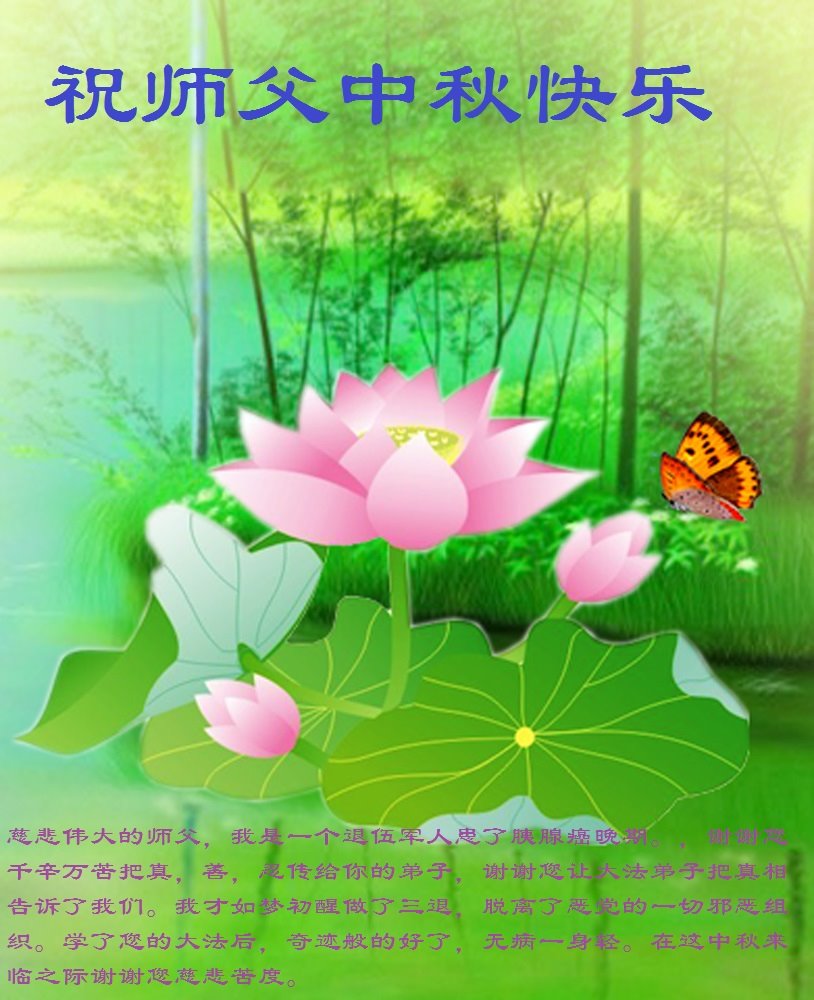 慈悲伟大的师父好!我是一个退伍军人,曾患胰腺癌且已到晚期。谢谢您千辛万苦把“真、善、忍”大法传给您的弟子,感谢您让您的弟子把真相告诉了我们这些未修炼的人,我才如梦初醒!脱离了中共的一切邪恶组织,并走入大法修炼。学炼了法轮大法后,我这个末期胰腺癌患者竟然奇迹般的康复了,现在无病一身轻! 在这中秋节来临之际,感谢您的救命之恩!恭祝您节日快乐! 中国河北保定农村新学员恭祝 山东省莱阳市一新学员恭祝慈悲伟大的师尊中秋佳节快乐!