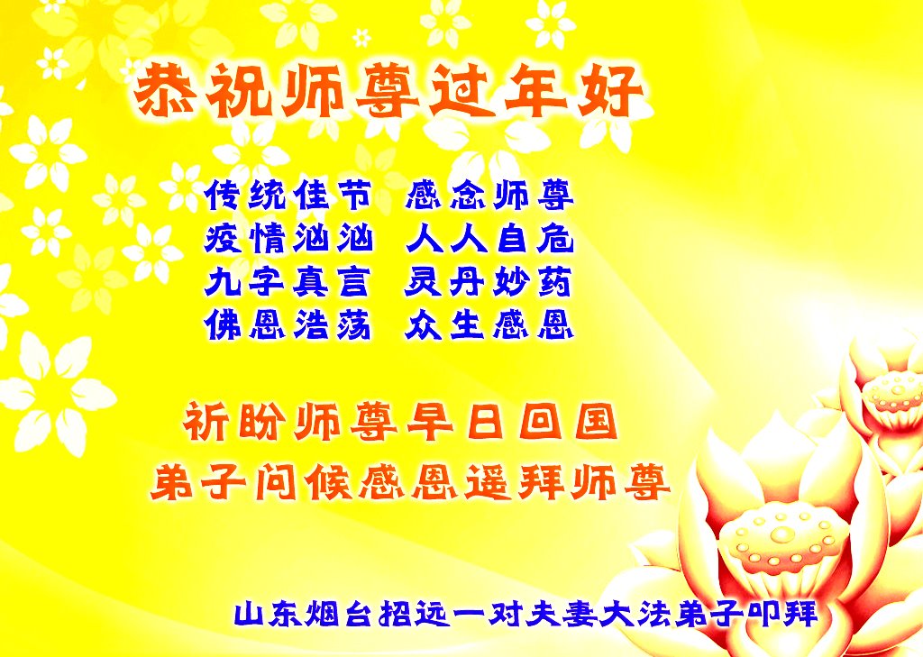 请师父放心,在新的一年里弟子一定要精進实修跟上正法進程,多学法、学好法,归正自己的一思一念,做好三件事多救人。 山东烟台招远一对夫妻大法弟子恭祝师尊过年好!
