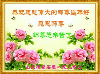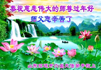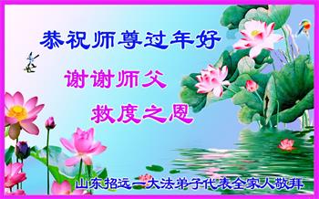 尊敬的师父好! 首先感谢师父对我们全家人的救度之恩!我们全家人恭祝师父过年快乐! 山东省聊城市莘县全体大法弟子恭祝慈悲伟大的师尊新年快乐!