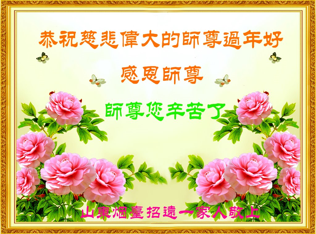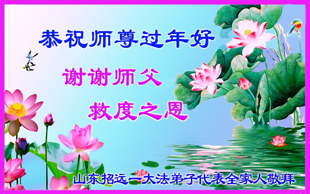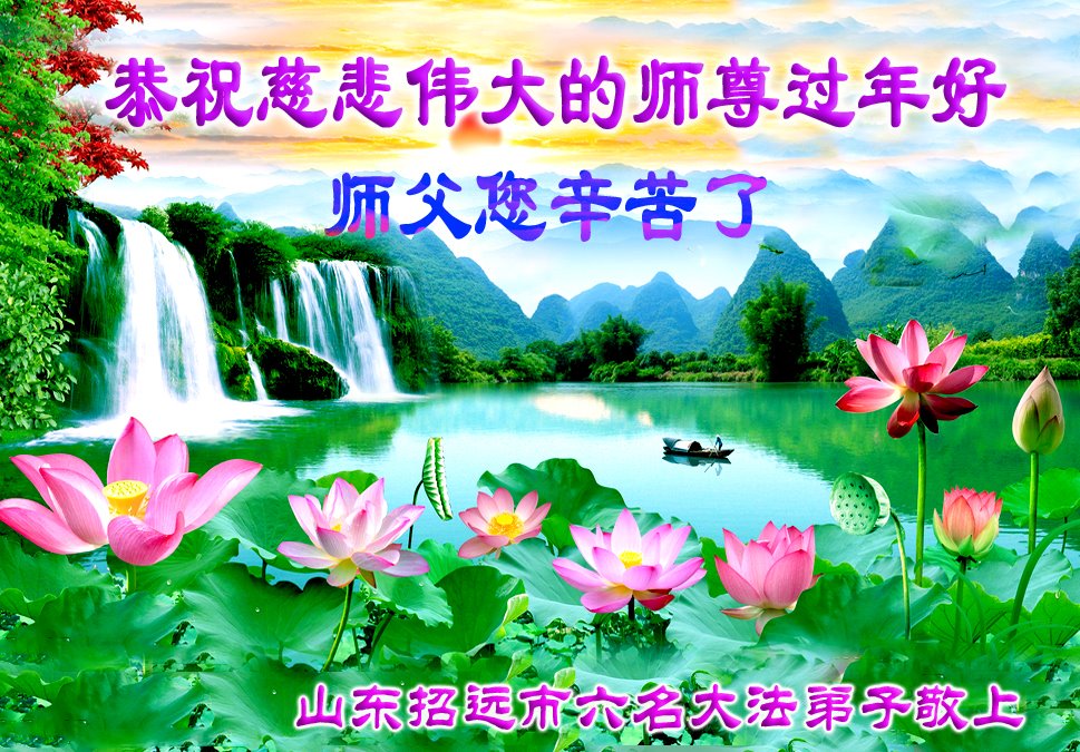 尊敬的师父好! 快过年了。弟子代表我的全家人叩拜师尊,恭祝师尊过年好!谢谢师父的救度之恩。 山东省烟台市招远市六名大法弟子恭祝慈悲伟大的师尊过年好!